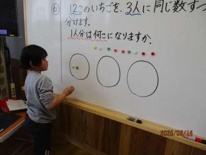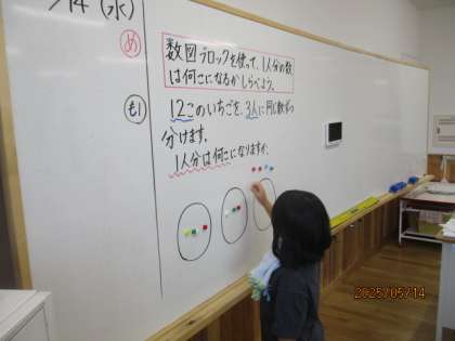 わり算の学習では、数図ブロックを使って分け方を考えました。