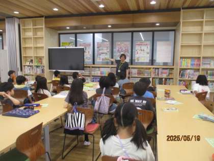 メディアセンターで読書ノートの使い方を学んだり、読み聞かせを聞いたり、本の貸し借りをしたりしました。