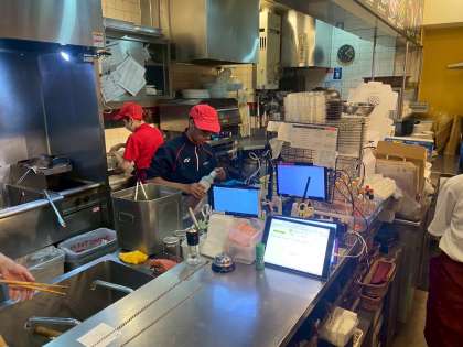 写真はある飲食店の様子です。料理を運んだり、ピザを作ったり、