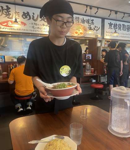 ラーメン屋さんでは、接客や配膳をしていました。実際に教職員もラーメンを食べに行き、8年生に接客をしてもらいました。店員さん同様に、「いらっしゃいませ!」「ありがとうございました!」など、大きな声で気持ちの良いよい接客を受けました。