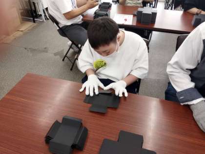 作業所では、お菓子の箱の制作を行っていました。4つの角を1つずつ折っていく作業は難しそうでしたが、作業所の方々と一緒に集中して取り組んでいました。