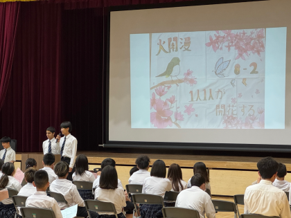 【8年生】学級目標の発表 公開日 2025/06/11 更新日 2025/06/11 学校の様子 6月10日の5限に児童生徒総会が行われました。 その中で、各クラスの代表委員が学級目標・学級旗の発表を行いました。 5〜9年生という大勢の前で、堂々と話している姿がかっこよかったです。