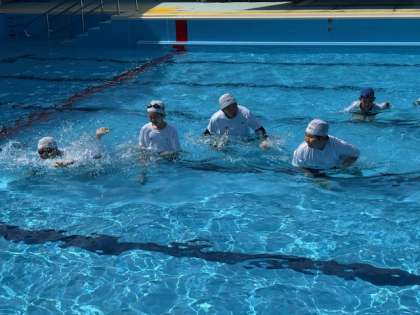 消防署の方をゲストティーチャーとして招き、着衣泳を行いました。