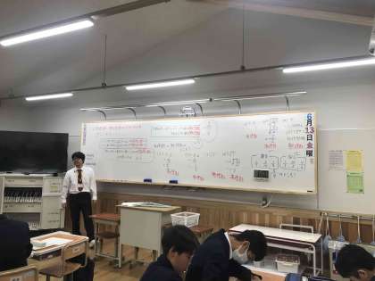 9年生の数学では引き続き実習生の授業が実施されています。1回目から2回目,2回目から・・・と,授業をする側,受ける側の雰囲気がよくなっています。授業というのは先生がすべてを作るものではありません。真剣に聞く人・考える人・教える人・質問する人,一人ひとりに責任があります。そうしてよくなることで学力が身につき,近い話でいうと受験でいい結果を手にすることができます。これからも9年生の仲間でいい授業を作っていきましょう。