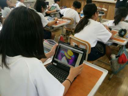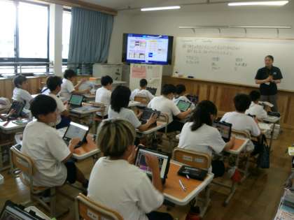 外国語では「who is this]という単元でこの先生は誰でしょうというクイズを作成しています。クイズを行うにはどのような表現が必要なのか、タブレットなど用いて学習しています。