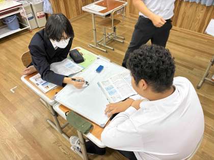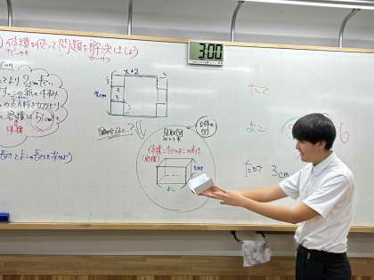 授業の様子【9年生数学】 公開日 2025/09/09 更新日 2025/09/09 学校の様子 二次方程式の文章題もラストを迎えています。昨日は体積から長さを求める問題。そして本日は“動く点の問題”に挑戦しました。●秒経ったときに点がどこにあり、どのような面積になるのか、図や絵を用いて考えることができました。