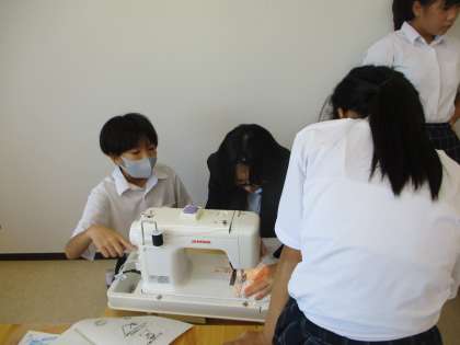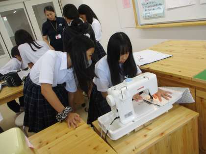 家庭科の学習では、ミシンを使って手さげバックを作っています。班のみんなで協力をしながら作成しています。