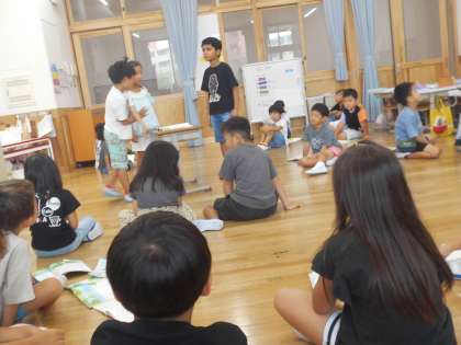 好きな場面を決めて、あおむしや木などになりきって音読会をしました。表現に合わせて声の大きさや高さを変えたり,体で表現したりしながら楽しそうに発表していました。