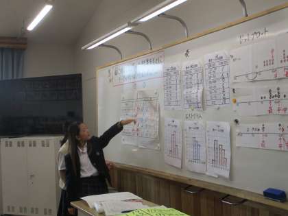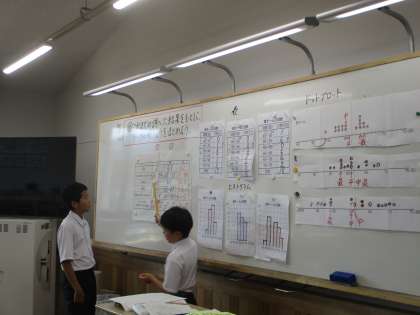 6年 算数「データの整理と活用」 公開日 2025/10/10 更新日 2025/10/10 学校の様子 算数の「データの整理と活用」の学習では、データをドットプロットや表、ヒストグラムなど様々な方法で整理をしてきたものをまとめました。まとめたものを見ながら分析をして、意見を言い合うことができました。