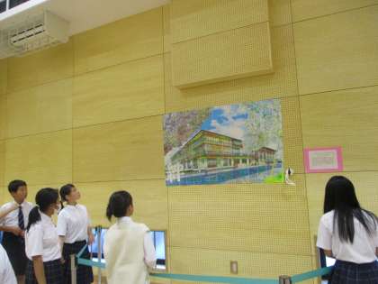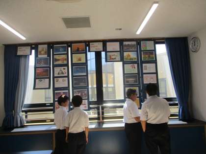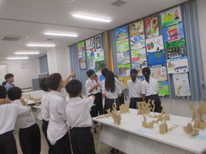 文化祭の展示鑑賞をしました。他の学年の作品を興味津々に鑑賞していました。