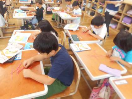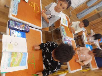 棒を並べて形や文字を作ったり、一本だけ動かして違う数字に変えたりしました。できた喜びを友達と伝え合う姿が素敵でした。