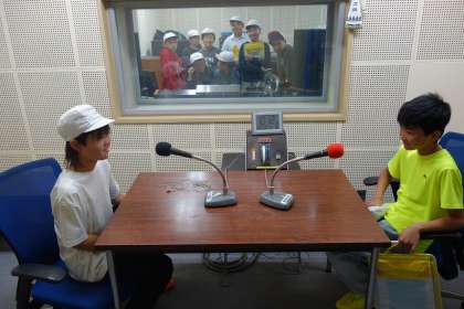 見学の途中に、使用していないスタジオ内にも入らせてもらって、出演者側と編集者側に分かれてマイクを通して指示を出したり、指示に従ってマイクに向かって声を出してみたり、放送体験にチャレンジさせてもらいました。