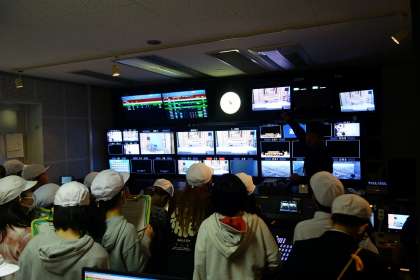 ラジオ放送の現場を見学した後は、テレビ放送の様子も見学しました。夕方のニュース番組『きょうとDays』のスタジオをバッグにテレビカメラに撮影してもらい、モニター画面に映った自分たちの姿を見ることができました。スタジオ横の副調整室ではたくさんのモニター画面について説明を受け、映像の切り換え方法などをくわしく教えていただきました。