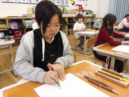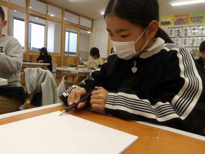 4年生で初めて使う彫刻刀。安全な使い方を確かめ、いざ版を彫り進めています。