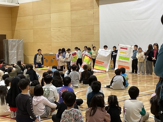 1stステージ集会を行いました。1月のステージ目標である「あいさつをしよう!」について、各学級からふり返った後、たてわりグループで遊びをしました。