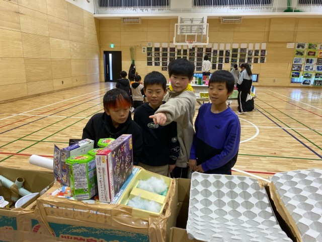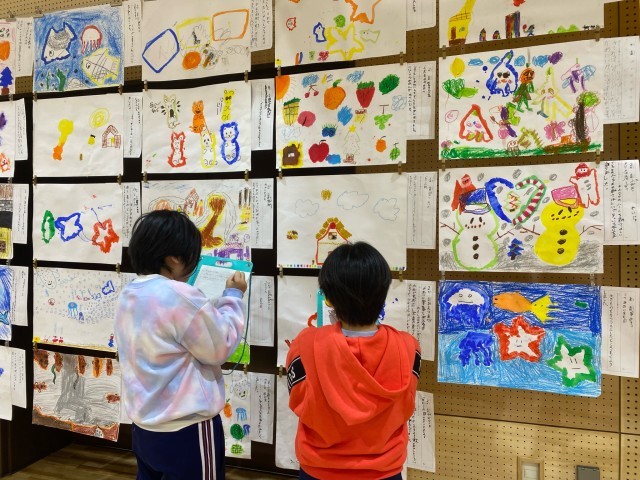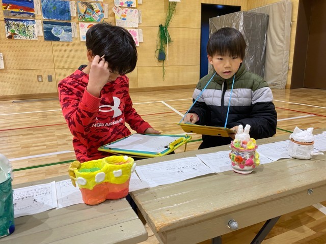 作品展の鑑賞会をしました。子どもたちは、作品の「色」や「形」に注目しながら、それぞれの作品のよさを味わっていました。