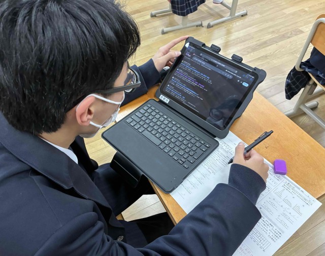 本日は(珍しく?)タブレットを使って学習しました。初めに“箱ひげ図”の問題に取り組んで、その後は各自の課題に没頭していました。3年も経てば上手に学んでいます!