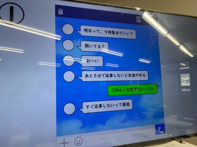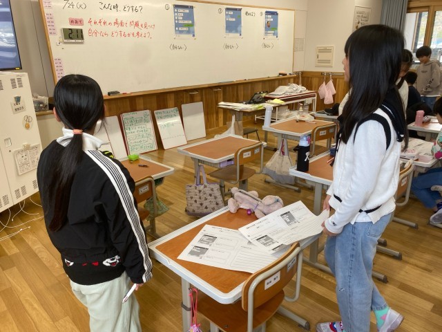 情報モラル学習を行いました。メッセージ(文字)だけでのやりとりを見て、「問題点はどこかな?」「自分なら…」と考え、友達と交流をしました。クラスで話し合っていく中で「絵文字やスタンプも気持ちを伝えるために有効だ」「何かあれば大人に相談する」という意見も出てきました。すてきです。