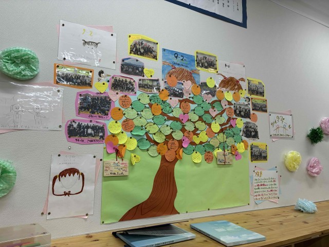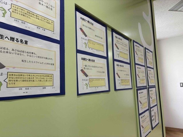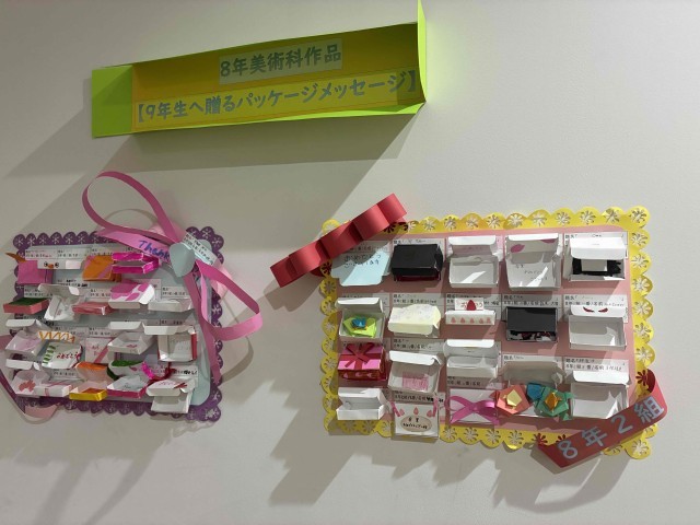 9年生の“卒業”が目の前に迫り、色々な作品が飾られています。みなさんの気持ちがこもっていて素晴らしいですね。