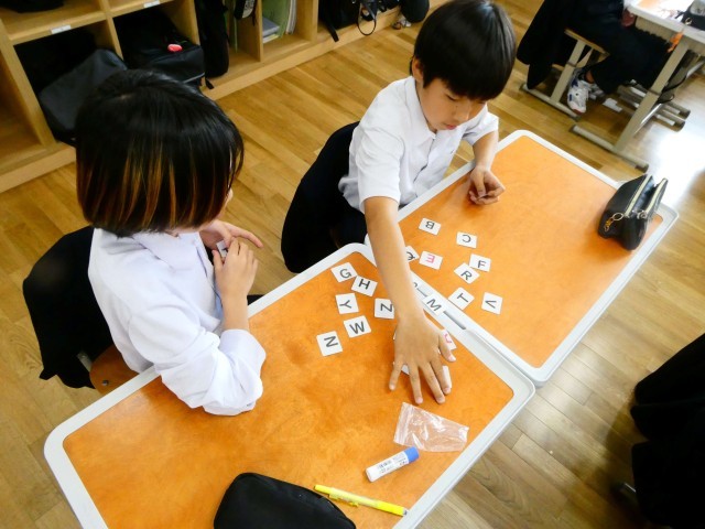 英語の授業ではアルファベットかるたに挑戦していました。和気あいあいと取り組んでいます。