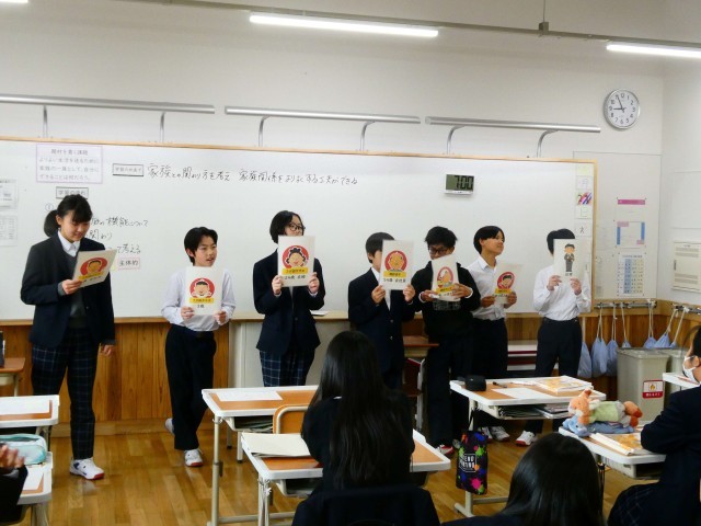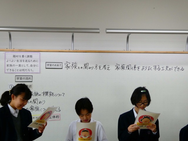 授業の様子【7年生家庭科】 公開日 2026/04/22 更新日 2026/04/22 学校の様子 家庭科の授業では生活をよりよいものにするために、どうすればいいか学びました。発表している様子です。 7年生