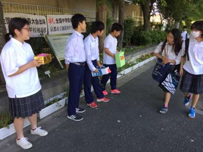 今日から一週間、6月の「義援金活動」がはじまりました。生徒会の生徒が朝から元気なあいさつと共に募金を呼びかけています。
