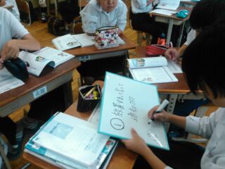 「受験生あっこの日記」という資料で行いました。ねらいは、「節度、調和のある生活」です。4人程度の少人数で話し合う場面を取り入れて行いました。「考え、議論する道徳」実践しています!