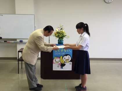 放課後には「社会を明るくする運動」の標語の表彰式が北区役所で行われました。本校からも2名が表彰されました。入賞した標語はつぎの標語です。