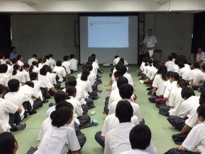 今日の2年生の道徳は教頭先生による「学年道徳」です。2年生の生徒は全員「せせらぎホール」に集まって教頭先生の話を聞いています。内容は「ピアス」や「SNS」のことなどを題材に、生徒と考える楽しい道徳でした。