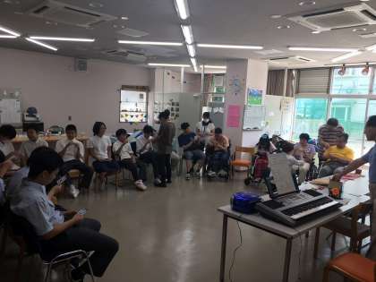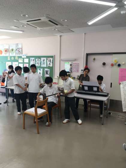 授産所の利用者、職員さんと旭丘中学校の生徒のみんなと仲良く歌を歌ったり、ビンゴゲームをしたり、日頃の学習発表を行いました。