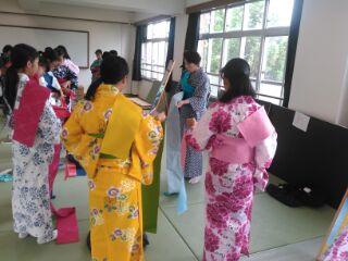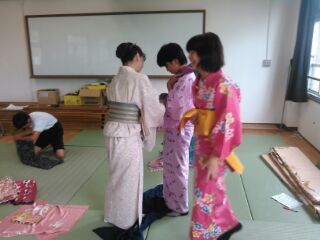 今日と明日、和装推進委員会講師の指導で、家庭科授業の一環として和装体験を行います。エアコンの効いたせせらぎホールで、あれやこれやと苦労して浴衣を着たり、折りたたんだりしています。