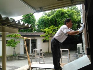 本校は今年の3月に「学校リニューアル(改修工事)」を終え、校舎内も外壁も大変美しくなりました。それでも激しい雨が降ると、校舎間の通路が濡れたりすることもあります。そこで用務員さんが少しでも雨に濡れにくいようにと、工夫をしてくださっています。