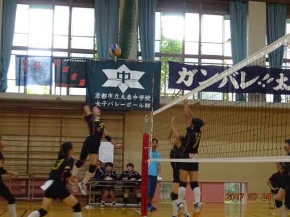 バレー部はベスト8をかけて、洛北中学校と対戦しました。1セット目は前半リードしながらも取られてしまいましたが、2セット目は接戦の末、取り返しセットカウント1−1で3セット目を迎えました。1点・2点と先に取りながらも、追いつかれ、最終的には負けてしまいましたが、クイックを決めたり、ベンチに突っ込みながらもボールを拾うすばらしいプレーの連続でした。
