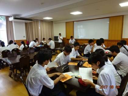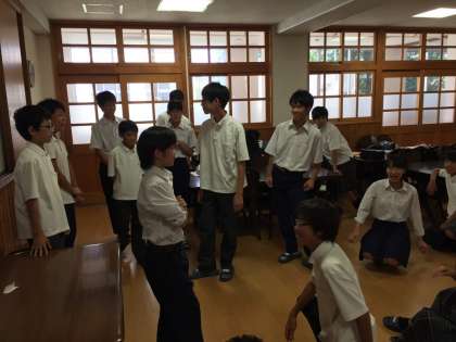 今日は一日「リーダー研修会」です。この取組は生徒会主催の行事で、1.2年生のクラスの代表が参加し、生徒会本部の生徒と共にリーダーとしての力を高めるのが目的です。