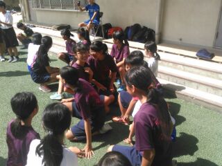今回は加茂川中学校のすべての体育系部活動が開催しました。写真は陸上部です。練習前に緊張している小学生を和ませるゲームをしています。
