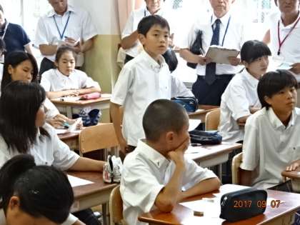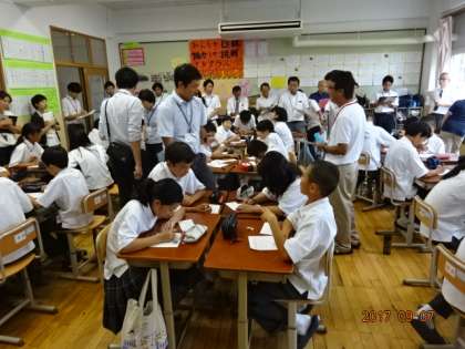 加茂川中学校は1年生の数学の授業です。30人以上の他校の先生に囲まれての授業でしたが、生徒は落ち着いた様子で授業に臨んでいました。内容は「時計の2本の針の角度」についての学習です。班ごとに考えたり、話し合いながら学習を進めました。