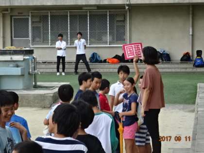 今日は加茂川中学校区の4小学校の6年生を招いて、「小中交流会」を行いました。グランドへ全員集合し、まずは「教科学習」を体験します。