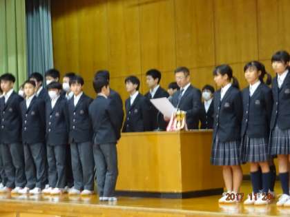 期末テストも終わり、今日の午後は生徒集会を行いました。京都市の秋の公式戦の日程もほぼ終了し、上位に入賞したチームや個人の表彰式も行いました。
