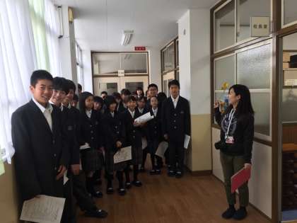 今日の1時間目は1年生の「学校案内」です。加茂川中学校は5つの校舎がある大変大きな学校です。他にも50メートルのプール(京都市の中学校では唯一)や専用のテニスコート、格技場(剣道部が主に使用)もあります。一回りするだけでも大変でしょうね。校長室にも来てくれました。元気の良いさわやかなあいさつが印象的でした。