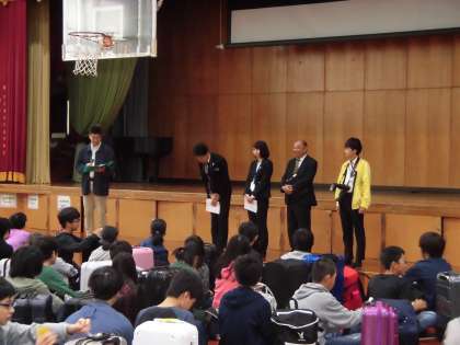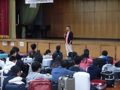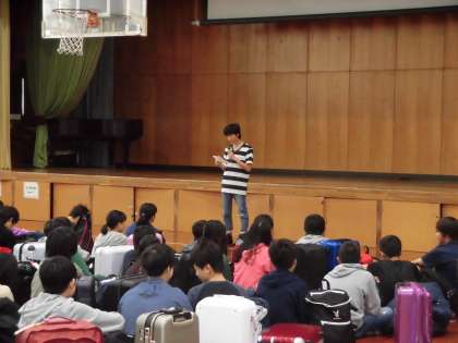 団長の学校長の挨拶に続き、修学旅行実行委員長の挨拶。そして添乗員さん、写真屋さんの紹介がありました。とても集中して良い雰囲気でした。