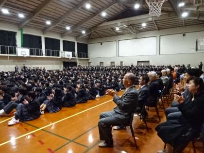 昨日は創立70周年記念講演会を行いました。講演に先立って、創立70周年記念関連事業実行委員長・学校長・生徒会長から挨拶がありました。その後、周年事業の一環として学校には「金屏風」を贈呈していただきました。「記念誌」と「記念ファイル」については2月頃配布を予定しています。地域の皆様・卒業生の皆様・教育委員会・保護者の皆様・生徒・教職員に支えられての70周年です。本当におめでとうございます。