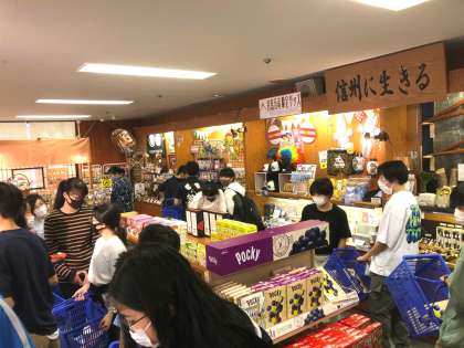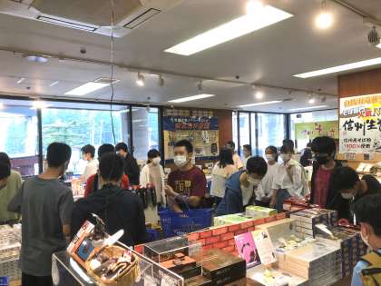 全員入ると混雑するので、クラスごとに入れ替えでお土産を探しています。