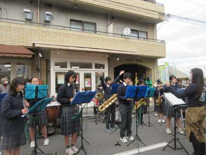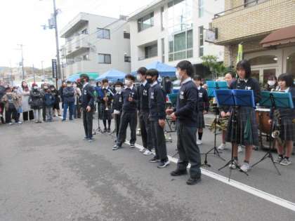 当日は朝から寒かったのですが、歩行者天国となった御薗橋通には沢山の屋台が出ていて子どもから高齢者の方までたくさんの人がいる中、演奏をしました。1曲毎に温かい拍手をいただき、曲間の楽器クイズで場が和み、2年男子のコントでは最高の盛り上がりを見せました。演奏後は高校生の演奏を聴き、一層努力していきたいという意欲や達成感を味わった行事でした。見に来て下さった皆さん、ありがとうございました。