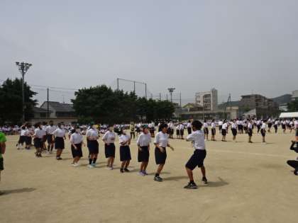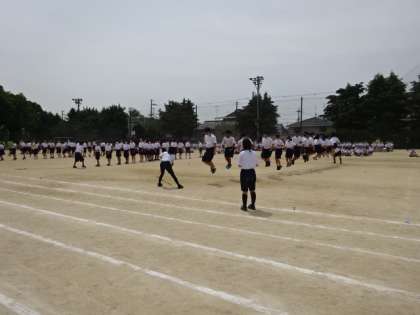 1年生学年種目「大縄跳び」です。クラス内で分けて、人数を少なくして跳ぶのですが、息を合わせて跳ぶのは難しいです。少しでも跳べるようにとクラスで、リズムを確認したり、声を合わせたりと工夫して取り組んでいました。これからもクラスでの取組の時には、意見を出し合って、工夫してお互いにカバーしながら進めていってほしいと思います。