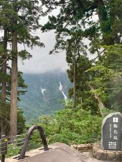 称名滝が見えたり、道路の脇を猿が歩いていたり、自然いっぱいの景色に癒されます。外の景色がだんだん白くなってきました。前は霧で真っ白です。