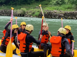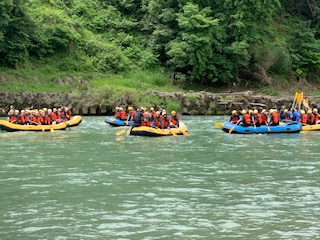 各グループのでインストラクターが、付き添って楽しくスタートです。天気は快晴。気温も上昇。素晴らしいラフティング日和です。楽しんで来てください!