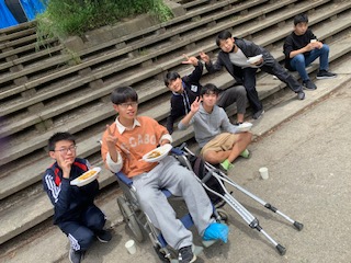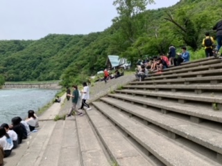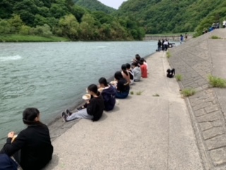 ラフティングから戻って来て、河原で昼食のカレーをいただいてます。