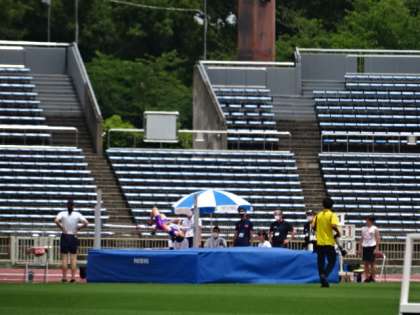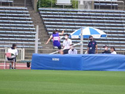 6月19日(日)たけびしスタジアム京都(西京極陸上競技場)にて、京都市中学校選手権総合体育大会陸上競技の部2日目が行われました。フィールドでは走高跳が行われていました。