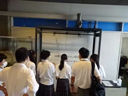 クラスによって分野は違いましたが、どれも身近にあるものを科学的に考えるきっかけを示してもらえた学習でした。また、10分間の休憩時間も展示スペースで、興味津々と気になる展示に釘付けの生徒もいました。