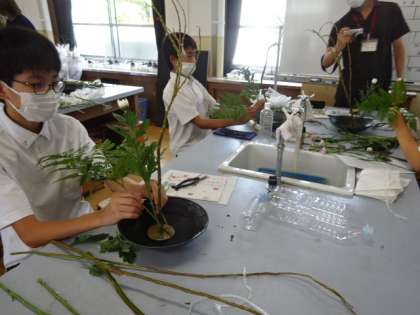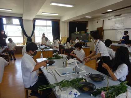 9月6日2年生で華道体験を実施しました。専門の講師の先生やサポートの先生方のご協力で,本校では初めての取組をすすめることができました。